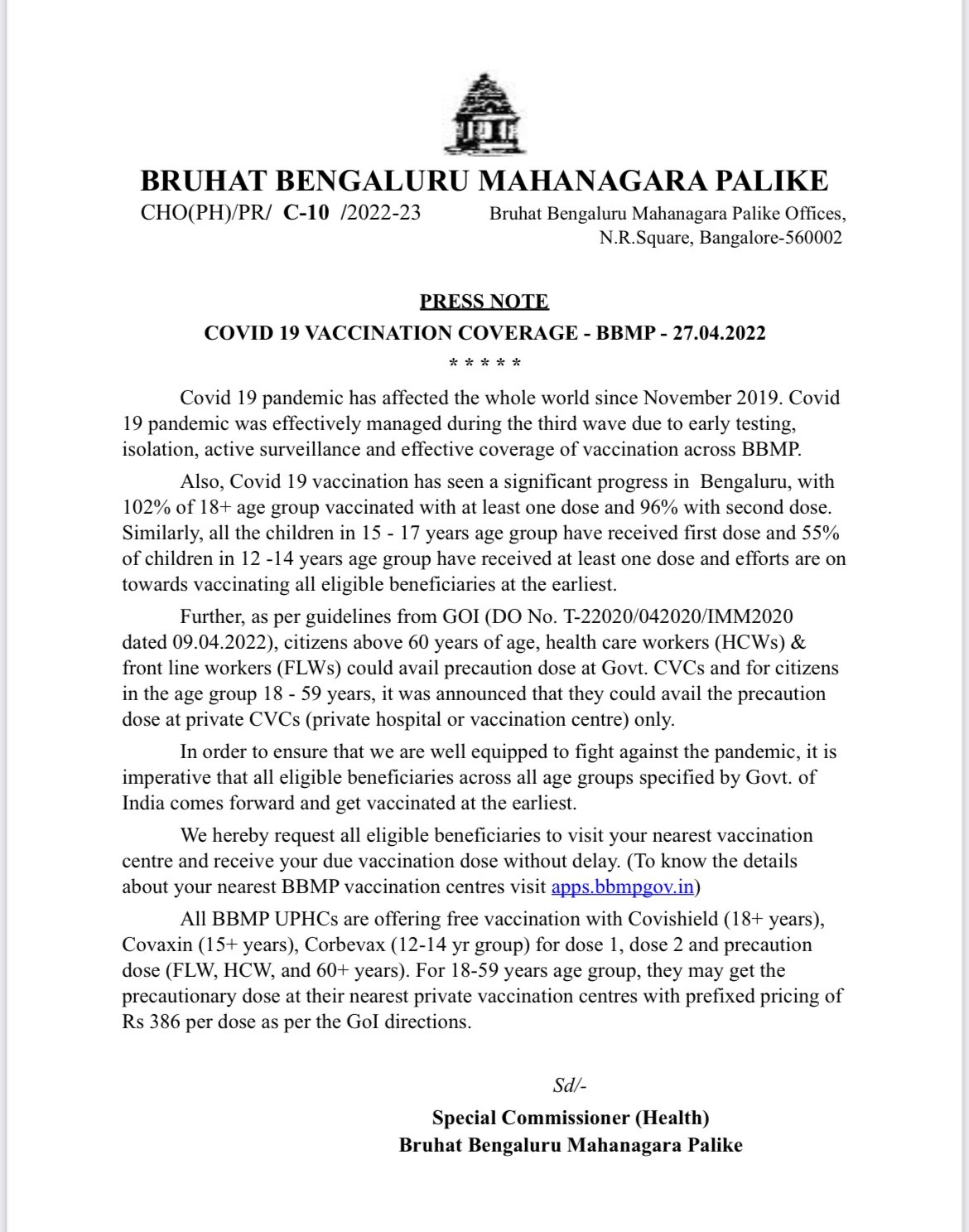 Tushar Giri Nath Ias On Twitter All Bbmp Uphcs Are Offering Free Vaccination For Dose 1 Covishield 18 Years Covaxin 15 Years Corbevax 12 14 Yr Group Dose 2 And Precaution Dose Flws